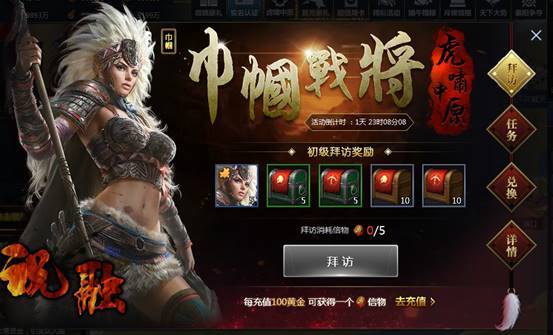 1. 每累计充值100黄金即可获得一个祝融信物,消耗一定数量的祝融信物可以拜访祝融获得相应奖励(祝融英雄碎片军械包),拜访的次数越多消耗的信物越多。
