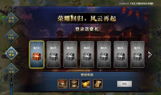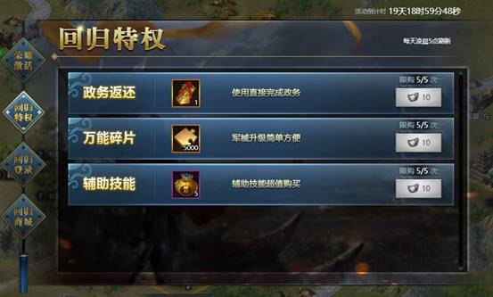 玩家回归后,每日登陆都可领取额外资源奖励。