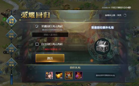 回归的玩家可在界面中输入邀请码,也可选择自主回归,赢取回归礼包、