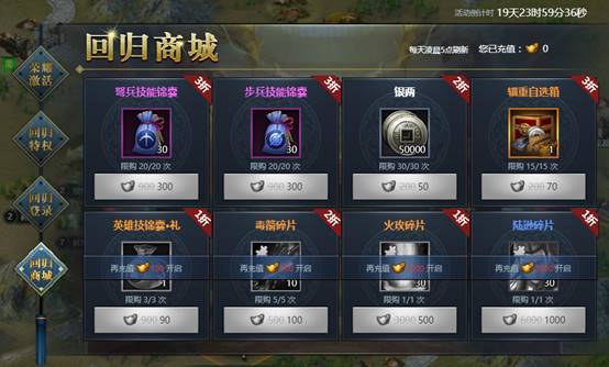 回归玩家专属的折扣商城,花费黄金即可购买道具及资源好礼~