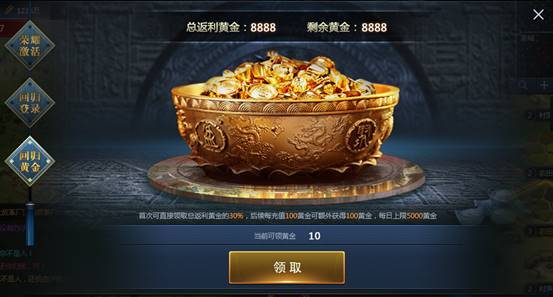 3. 剩余的返利黄金在后续充值中1:1返还,充值可一直累积返利黄金。返利黄金每日最多可领取4000黄金。