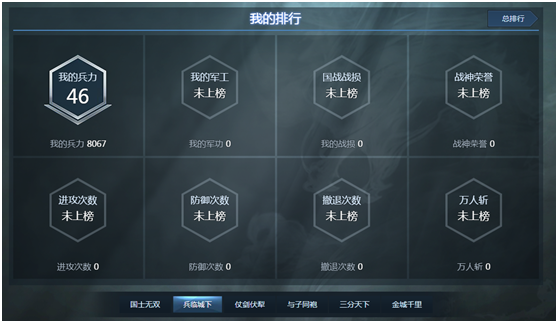 如图1-2“我的排行-兵临城下”中,玩家可以看到兵力与战斗相关信息;