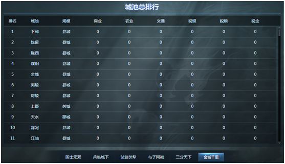 如图1-5“我的排行-金城千里”中玩家可以看到各城池的具体情形,包含了基础排名,规模、商业、农业、交通、税收等情况;这也是一种实力的体现;
