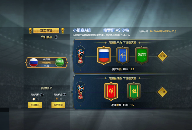 3. 主公们可以竞猜比赛队伍的胜负平、以及两支队伍总得分的单双(只统计比赛90分钟的数据)