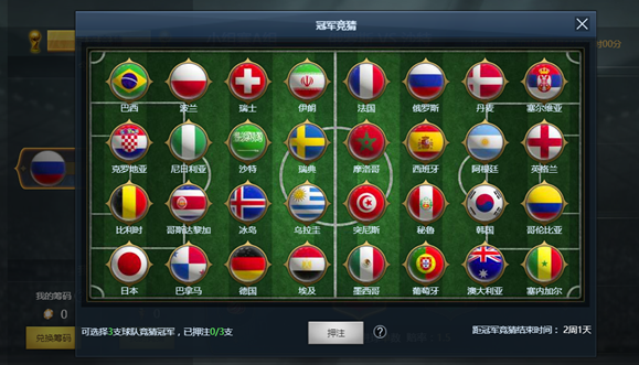 1. 从入围的24支队伍里选出3支心仪的队伍,进行冠军竞猜,根据队伍的强弱赔率也是不同的哦!