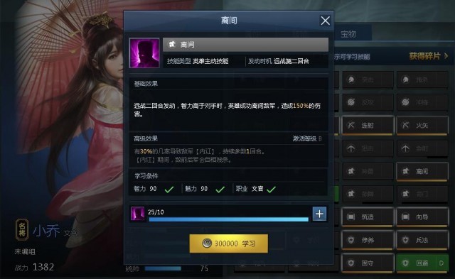 学习技能对英雄的四围属性(武力、智力、魅力、统帅)或英雄标签(文官、英雄、全才、性别)以及英雄兵种(步兵、骑兵、弓兵、弩兵)有要求;