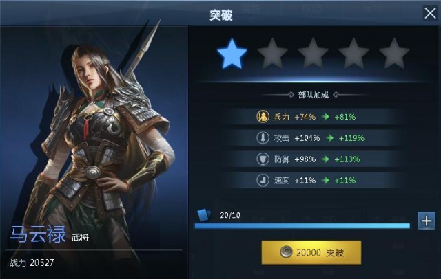 当英雄达到一定等级时,可进行突破,突破后增加兵力,防御和攻击