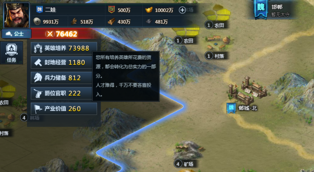 言下之意,玩家初期可以通过种田造兵等手段来提高总实力,期间也需要玩家在爵位官职上谋策出力,经过一定时间的养成,总实力得到一定程度的提升,就可以参与更多活动了。