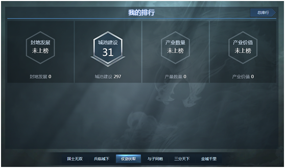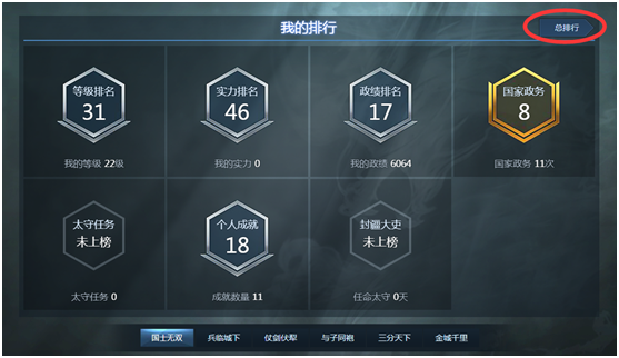 如图1-1,在《三十六计》“我的排行-国士无双”中可以看到玩家的等级、总实力、政绩、政务以及个人成就等;