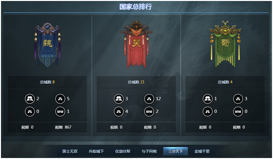 如图1-4“我的排行-三分天下”中,玩家可以看到魏国、吴国、蜀国的城池数、关城、县城、要塞以及税收信息,这一排行将更明确指出各国情况,相信对于广大玩家收集国战信息有一定的帮助;